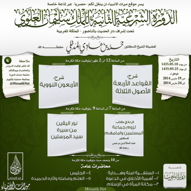 إعلان: دورة السلطان المولى سليمان العلوي الشرعية الثانية بمدينة الناظور تحت إشراف : العلامة الشيخ الدكتور: محمد بن هادي بن علي المدخلي حفظه الله تعالى وسدده.