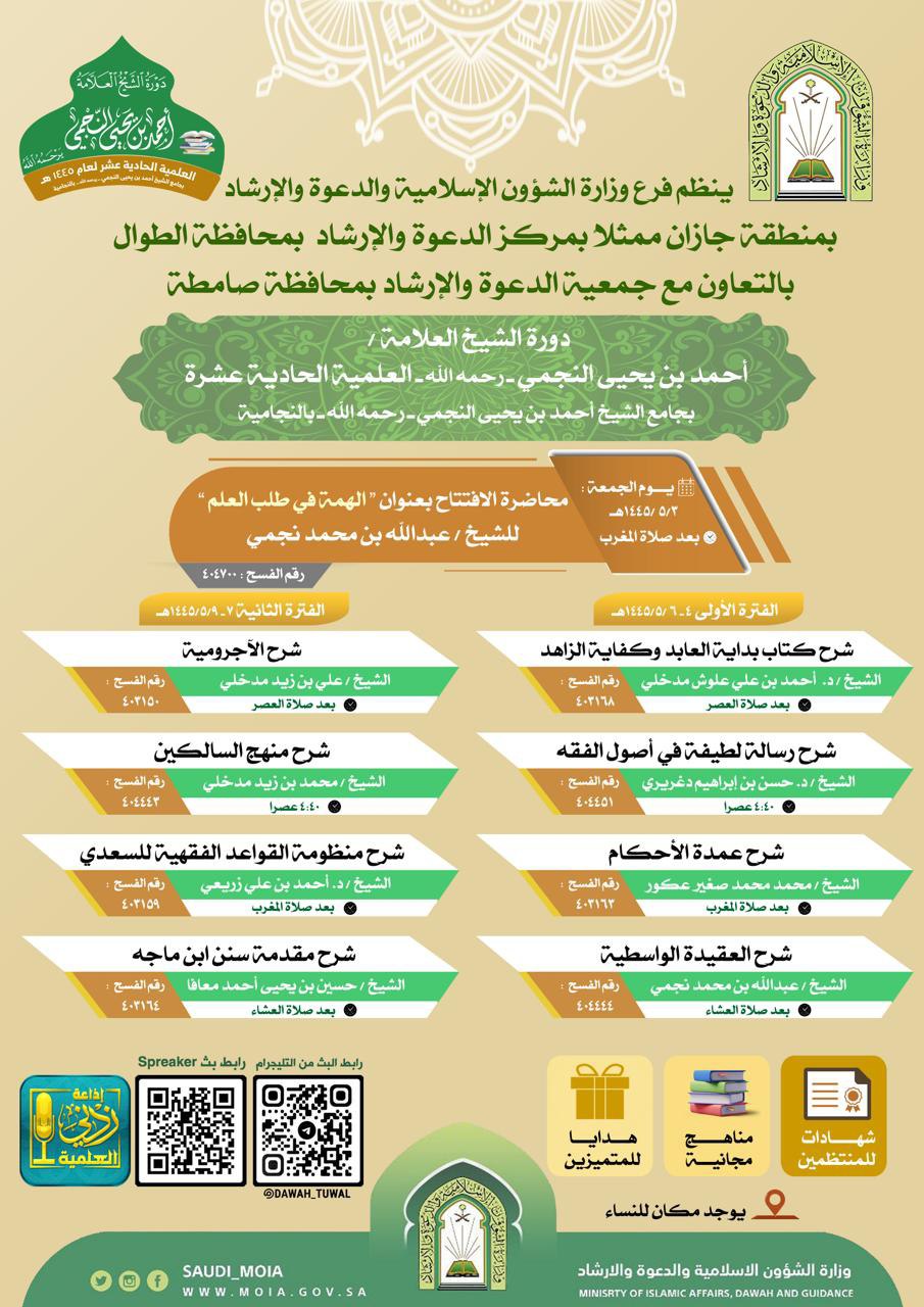 يطلق فرع وزارة الشؤون الإسلامية والدعوة والإرشاد في منطقة جازان ممثلاً بمركز الدعوة والإرشاد وتعاوناً من قبل جمعية الدعوة والإرشاد وتوعية الجاليات دورة العلامة الشيخ أحمد بن يحيى النجمي يرحمه الله العلمية بنسختها الحادي عشر ويفتتح فضيلة الشيخ عبد الله بن محمد النجمي هذه الدورة مساء غدٍ الجمعة الثالث من شهر جماد الأولى ١٤٤٥ هجرية عندما يتحدث عن الهمة في طلب العلم في جامع الشيخ أحمد بن يحيى النجمي بقرية النجامية التابع لمحافظة الطوال حيثما تكون الدورة .