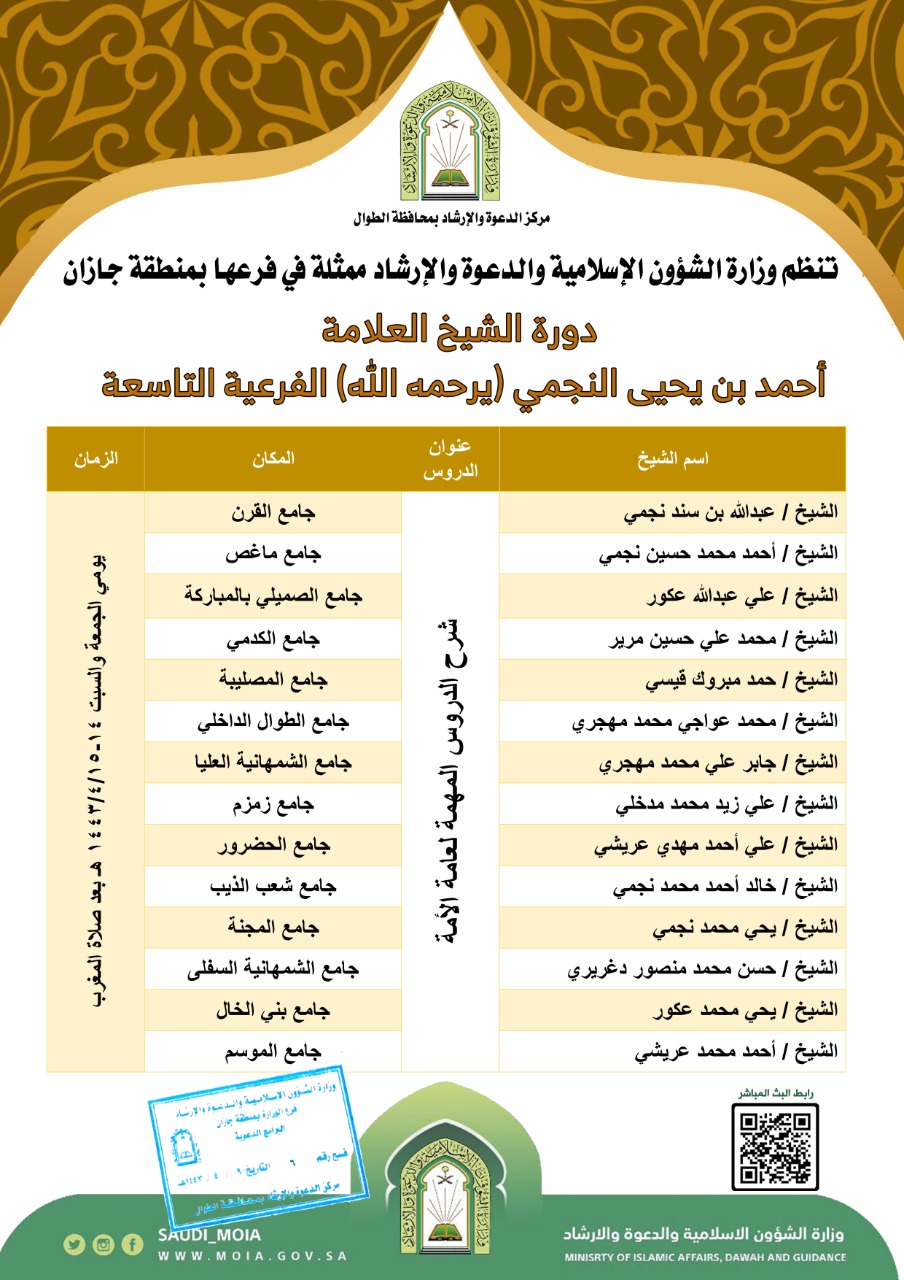 ينظم فرع الوزارة بمنطقة جازان، ممثلاً بمركز الدعوة والإرشاد بمحافظة الطوال، دورة الشيخ العلامة أحمد بن يحيى النجمي (يرحمه الله) الفرعية التاسعة، تحت عنوان: (شرح الدروس المهمة لعامة الأمة)، يلقيها دعاة الفرع خلال الفترة من الرابع عشر وحتى الخامس عشر من شهر ربيع الاخر الجاري، وذلك بجوامع المحافظة من بعد صلاة المغرب.