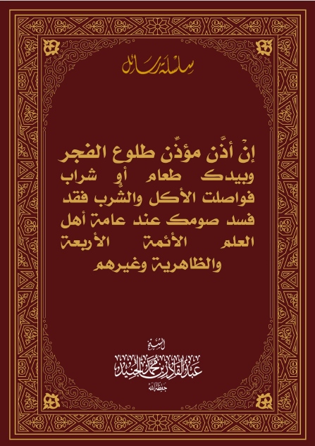 مقال إنْ أذَّن مؤذِّن طلوع الفجر وبيدك طعام أو شراب فواصلت الأكل والشُّرب فقد فسد صومك عند عامة أهل العلم الأئمة الأربعة والظاهرية وغيره الشيخ عبد القادر بن محمد الجنيد