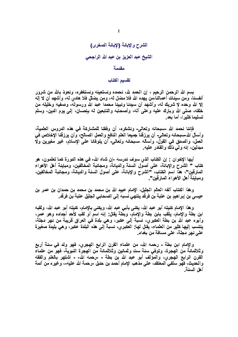 التصنيف : شرح لمتن الشرح والإبانة على أصول السنة والديانة (الإبانة الصغري)
