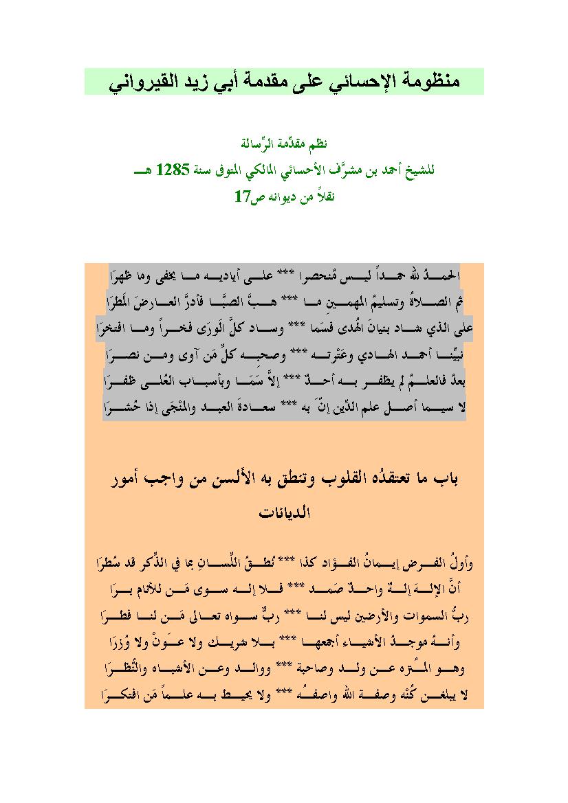التصنيف : شرح لمتن منظومة الاحسائي على مقدمة ابن ابي زيد القيرواني